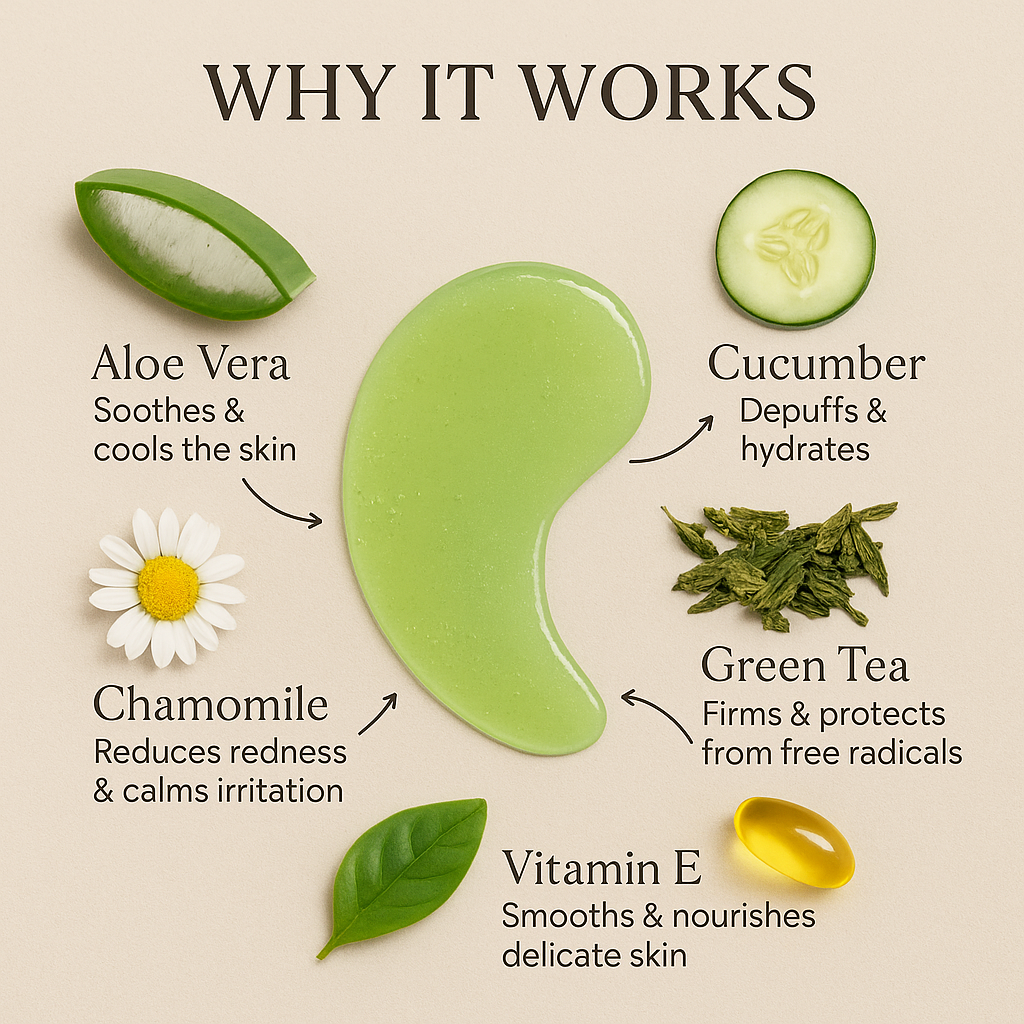 Infused with pure Aloe Vera, soothing plant extracts, and antioxidant-rich botanicals, each mask delivers hydration, calms puffiness, and helps reduce the appearance of dark circles — all without harsh chemicals or synthetic additives. Gentle, effective, and rooted in nature.